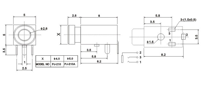 品名:2.5耳机插座 耳机插座技术参数: 1.额定负荷:0.5A 30V DC 2.按触电阻:100 mΩ max. 3.使用温度:-20℃~70℃ 4.插拔力:3-20N 5.使用寿命:5,000cycles 耳机插座主要组成部件: 1.塑胶底座 2.磷铜或铍铜簧片